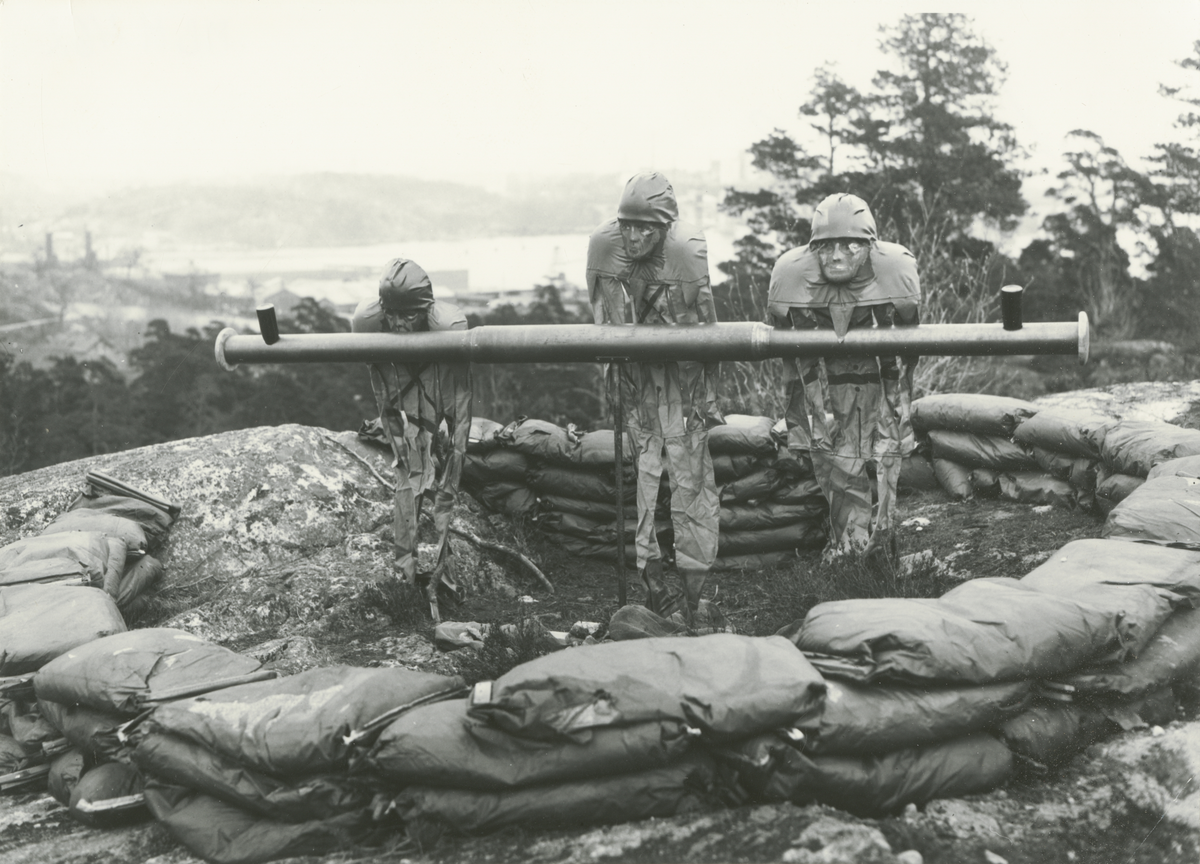 Attrapp föreställande en avståndsmätare, omgiven av en ring av säckar på en höjd. Mätaren betjänas av tre dockor.