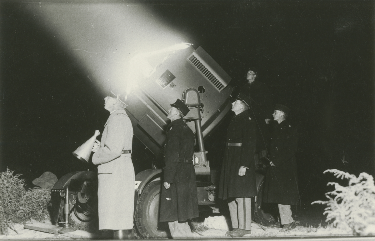 150 cm strålkastare m/1937, som lyser mot skyn.