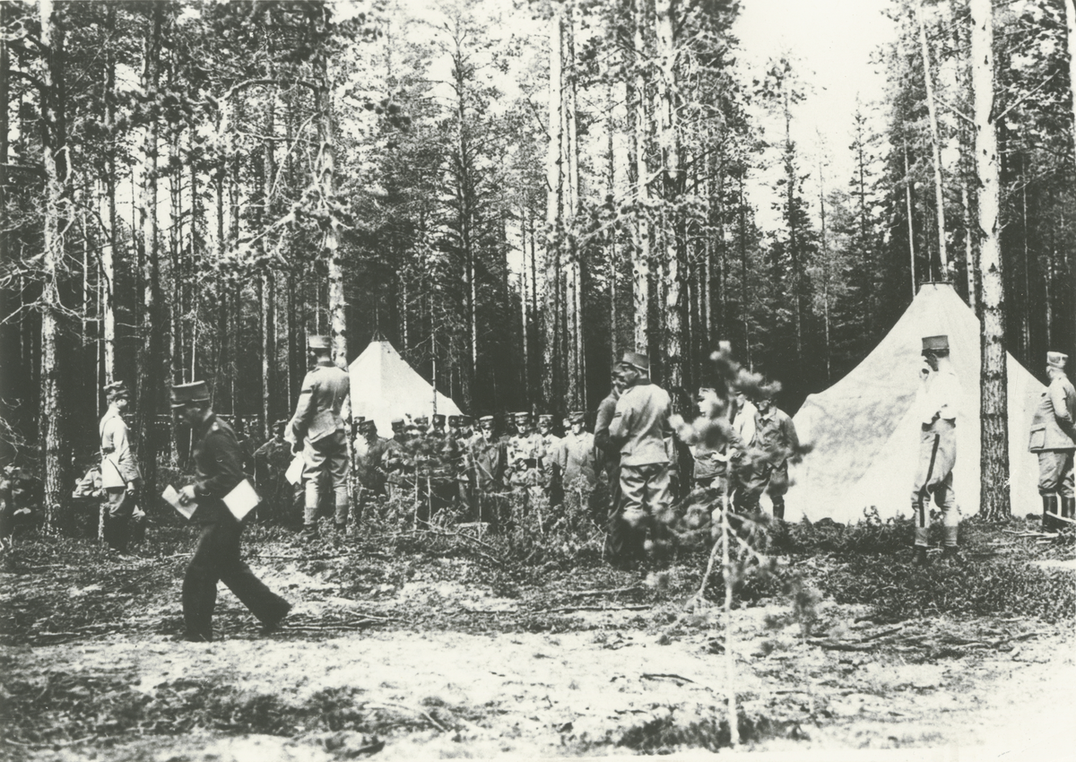 Norrlands dragonregemente K 4 under sommarmarschen 1936. Löjtnant Vogel tar emot sin tropp i Pitsundets bivack.