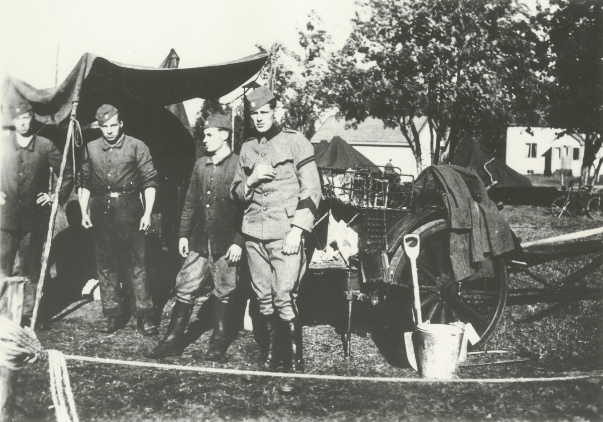 Fyra män utanför ett tält under K 4 övningar vid Sävar. En av männen är identifierad som 2 skvadronens kokchef, furir Andersson.
