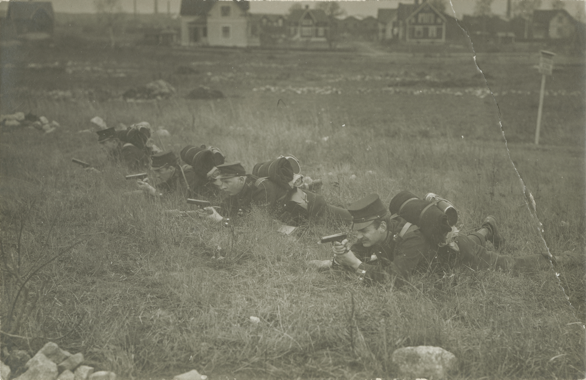 Patrull ur Södermanlands regemente I 10 signalavdelning, patrullen ligger ner med pistoler framdragna.