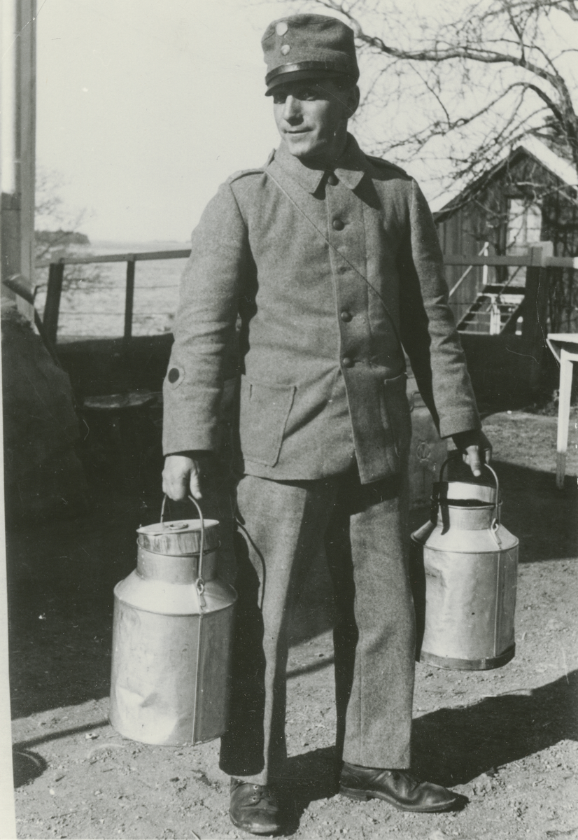 Kommissarie med facktecken för värnpliktig intendenturpersonal på Tjockö, håller två mjölkkannor i händerna.