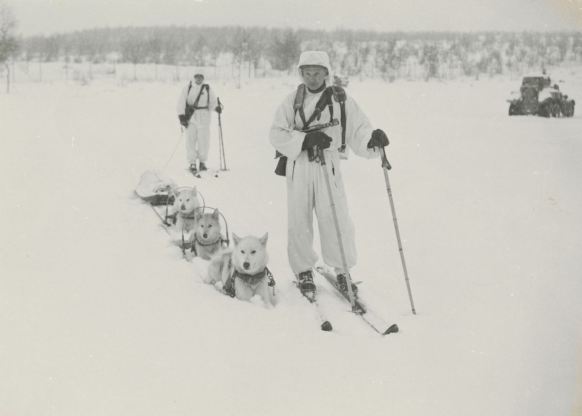 Draghundar drar en pulka med jägarutrustning över ett snötäckt fält.