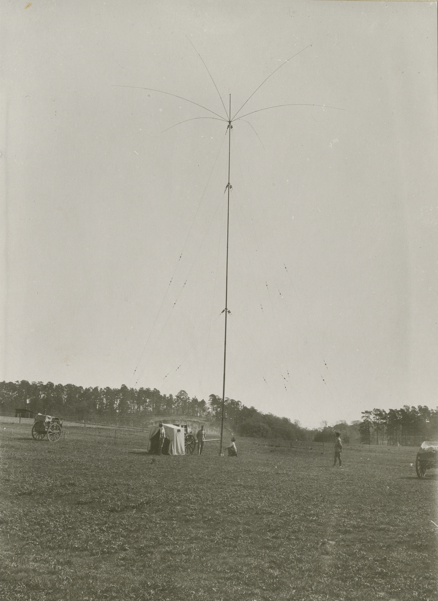 Titel: Mobil radiostation med hög mast uppställd på ett fält.