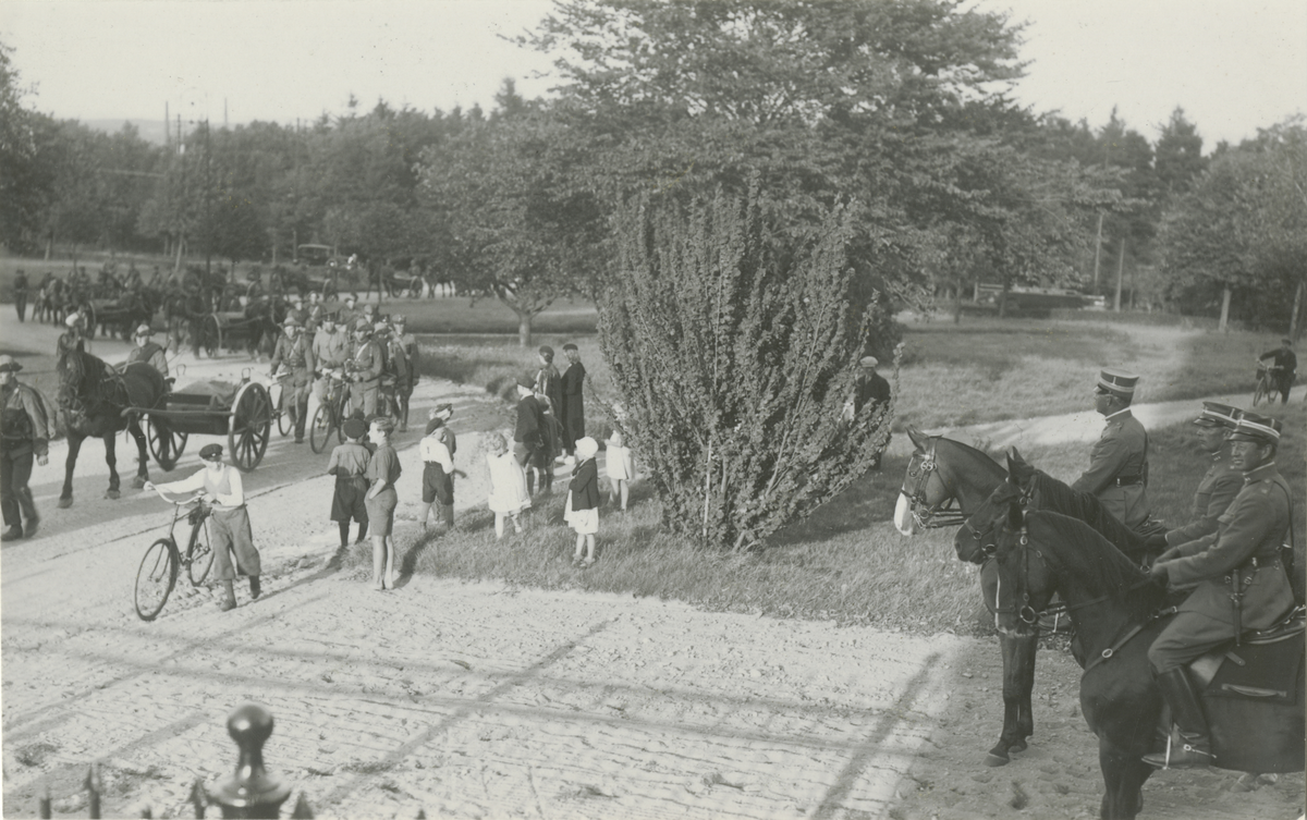 Titel: Tre officerare till häst betraktar en militärkolonn som passerar.