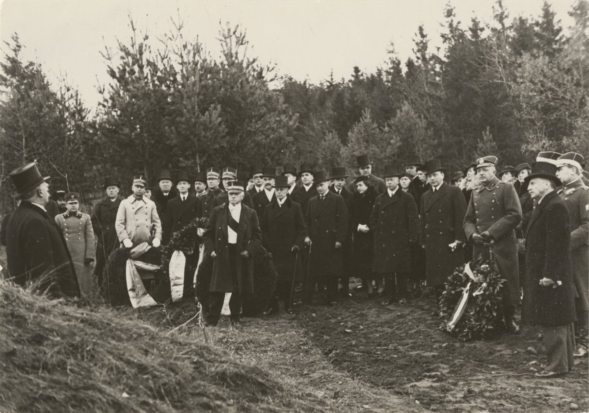 Civila och officerare lyssnar på tal vid en minnessten vid Gemesterhof, med den lettiske generalen Tepfers till höger.