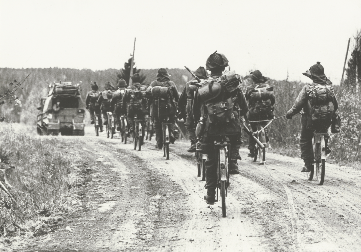 Titel: Cykeltolkning efter bandvagn på landsväg.