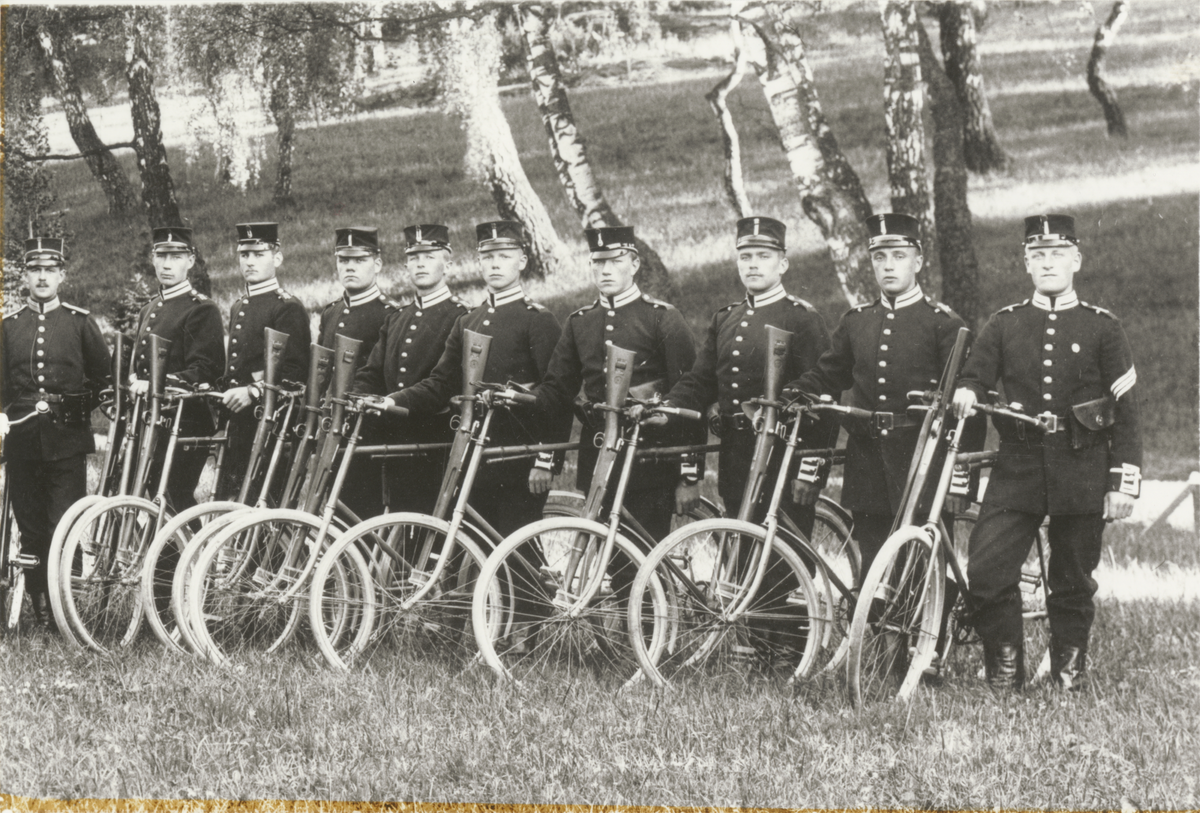 Velocipedavdelning uppställd i en trädbevuxen backe med gevär m/1896 hängande från cykelstyret, ca 1900.
