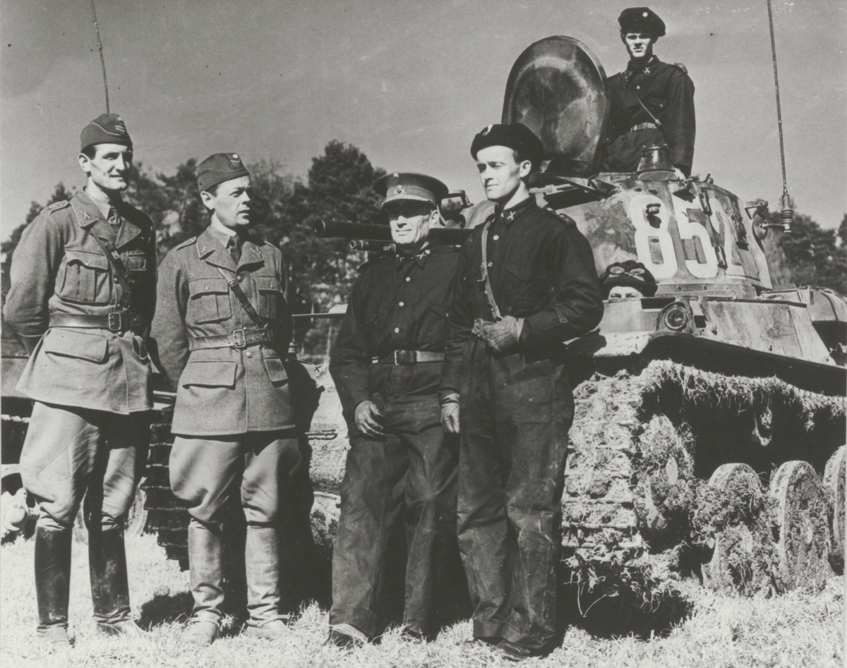 Titel: Fyra män poserar framför en stridsvagn 71/38.