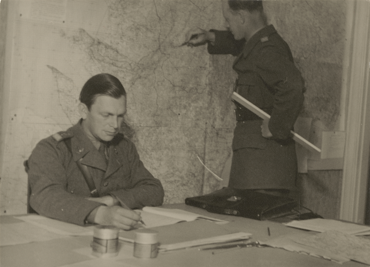 Titel: Löjtnant Tage Olin sitter vid ett bord medan en annan man studerar en karta på väggen.