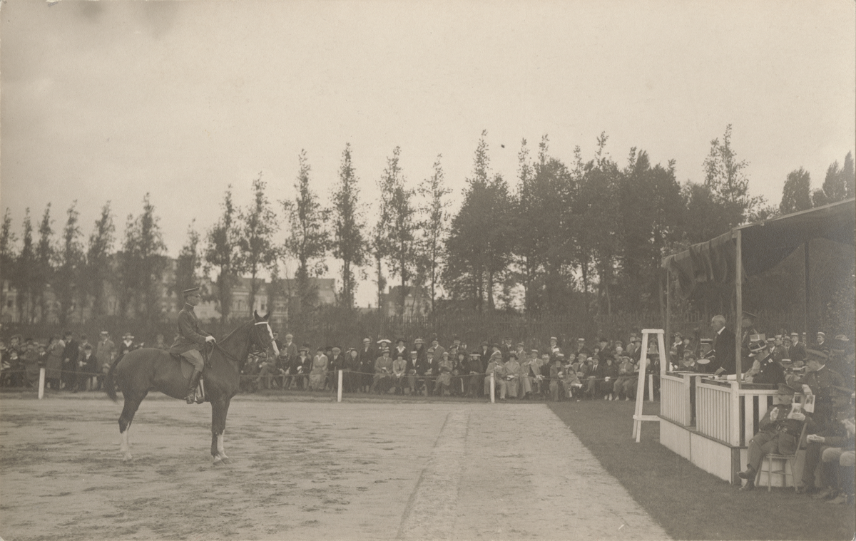 Man till häst lyssnar till talare på läktare, OS i Antwerpen 1920.