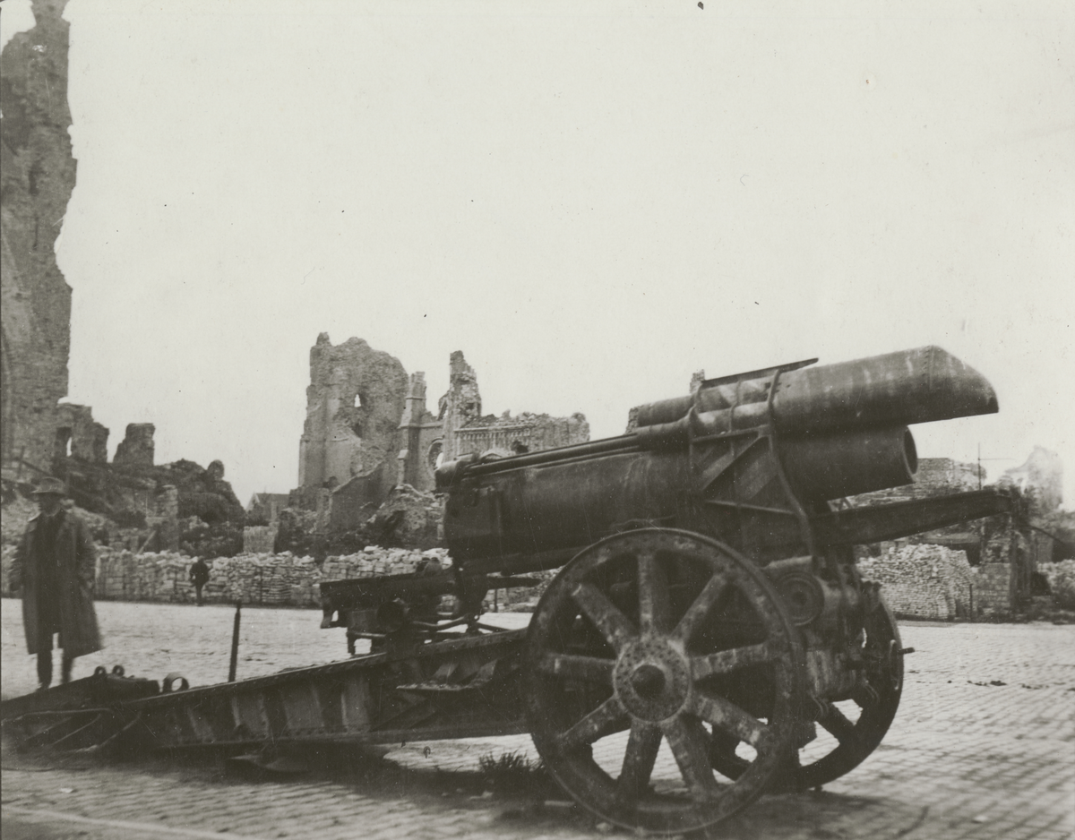 Söndersprängd grovkalibrig haubits vid en förstörd stad, första världskriget.