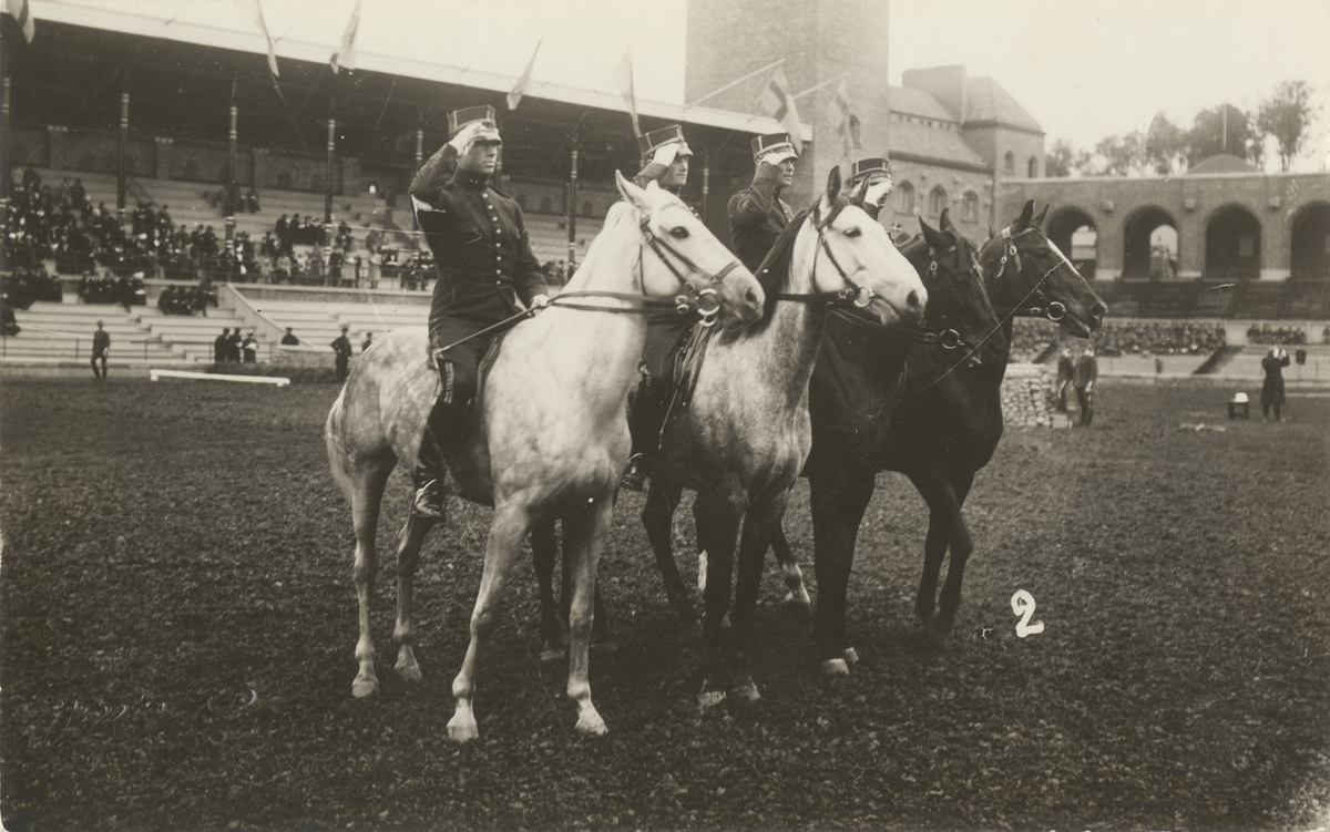 Ryttartävlingar, fyra ryttare gör honnör på stadion, 1914.