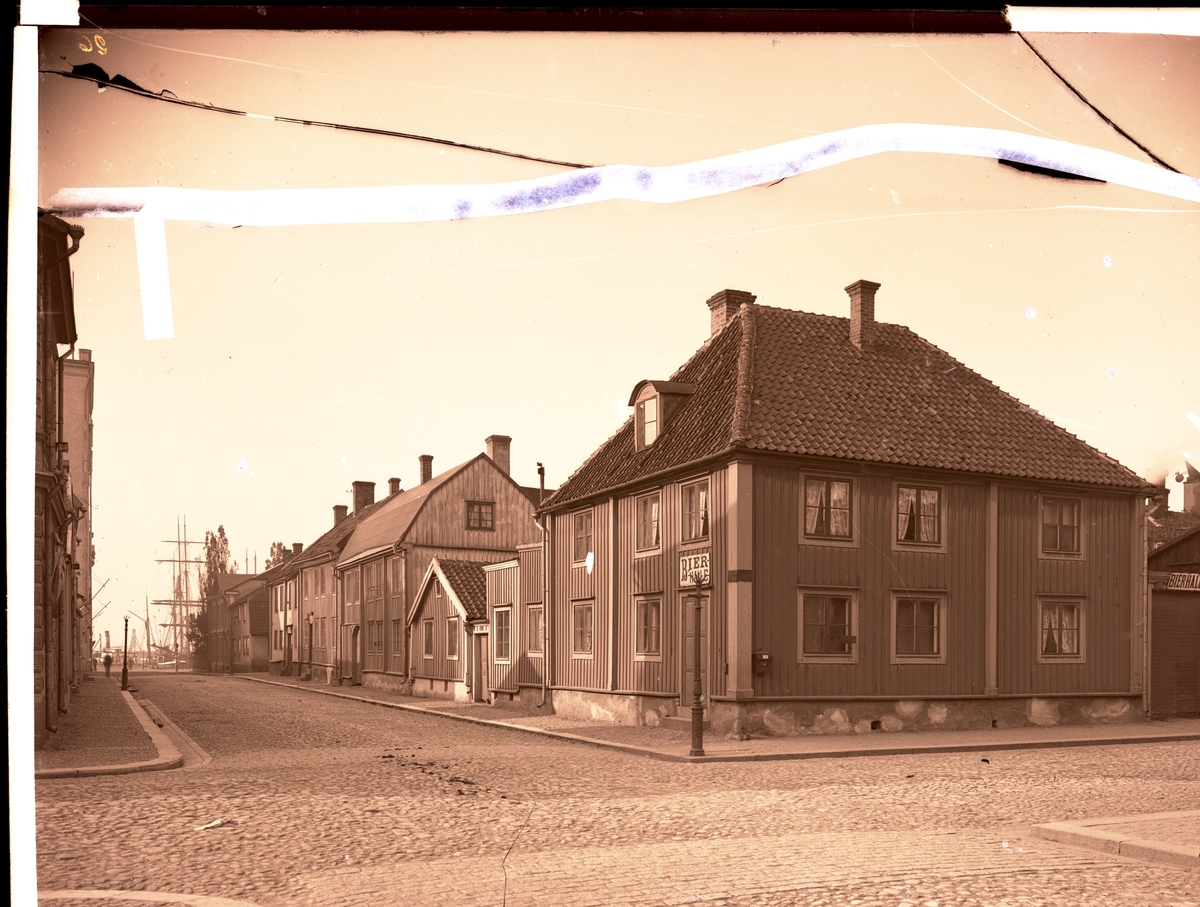 Hyreshus på Proviantgatan. I fonden syns det som senare kallats Tullhamnen. Svårt skadad glasplåt. Bild två digitalt retuscherad.