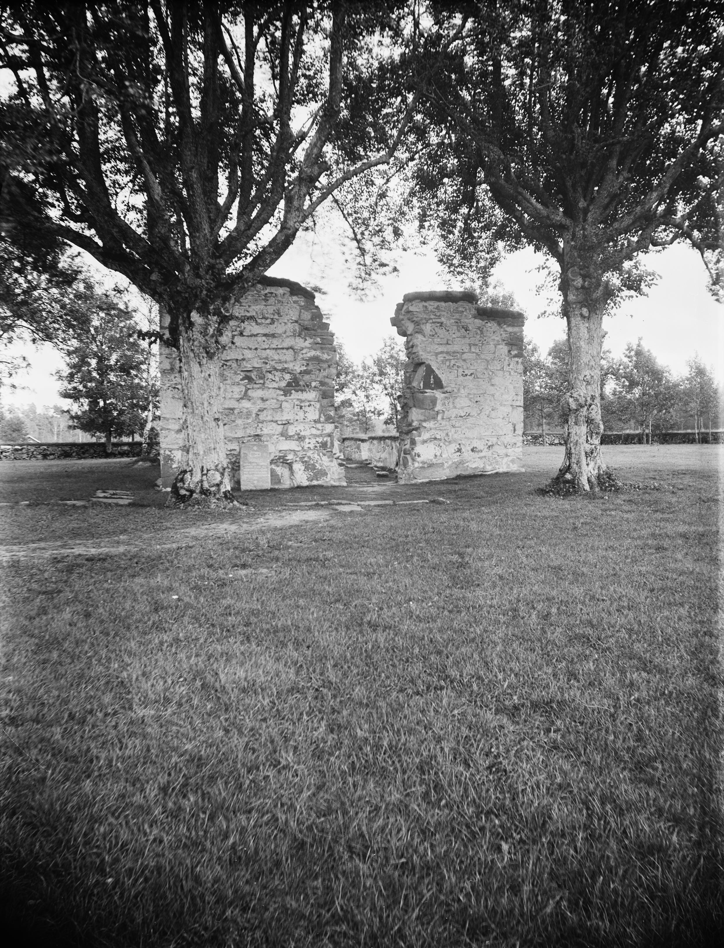 Kyrkoruinen från väster efter arbetenas färdigställande. Framför fasaden ses i marken "hällkistan".