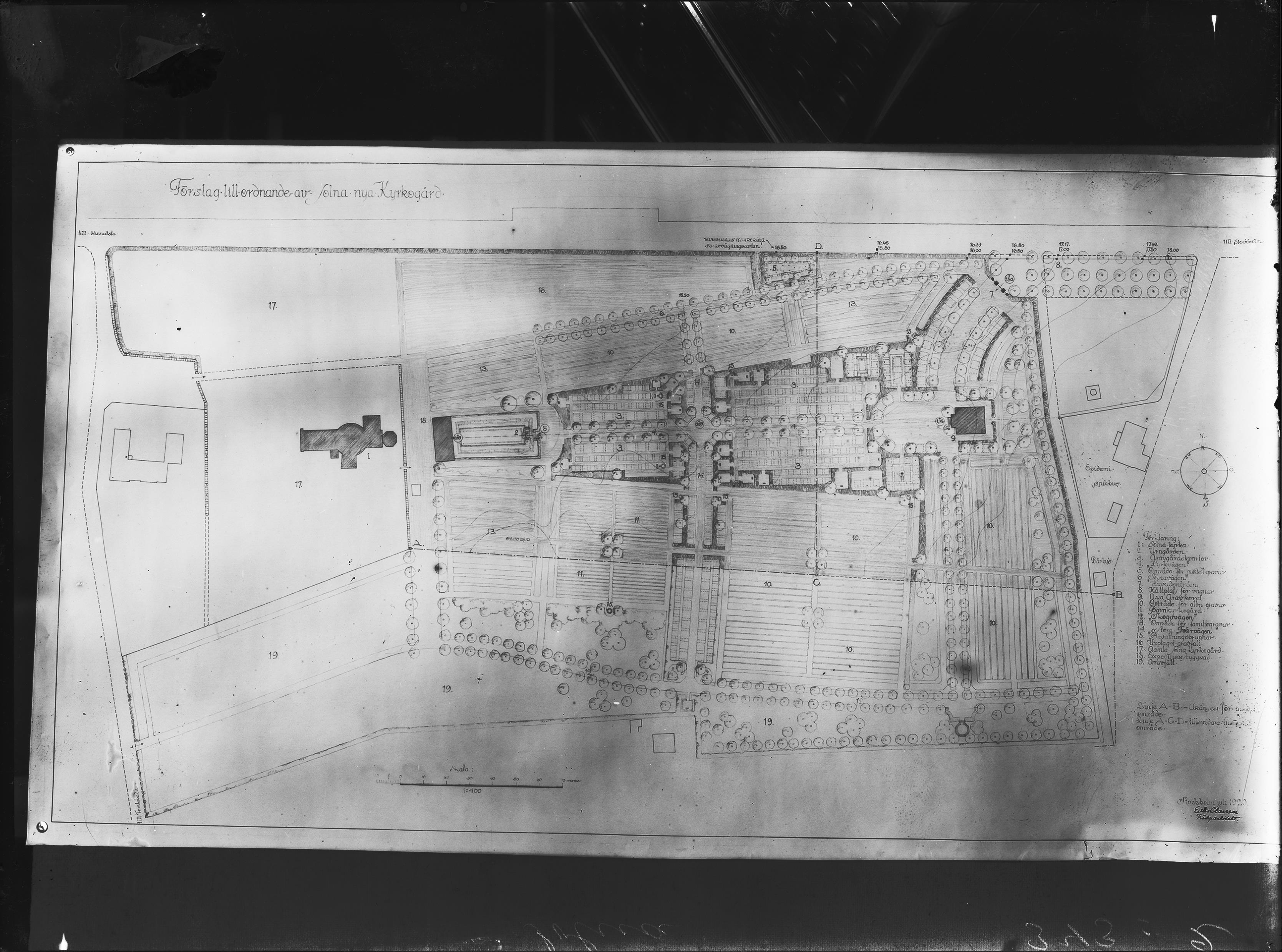 Planritning: förslag till ordnande av kyrkogårdsutvidgning, trädgårdsarkitekt Ester Claesson 1920. Avfotografering.