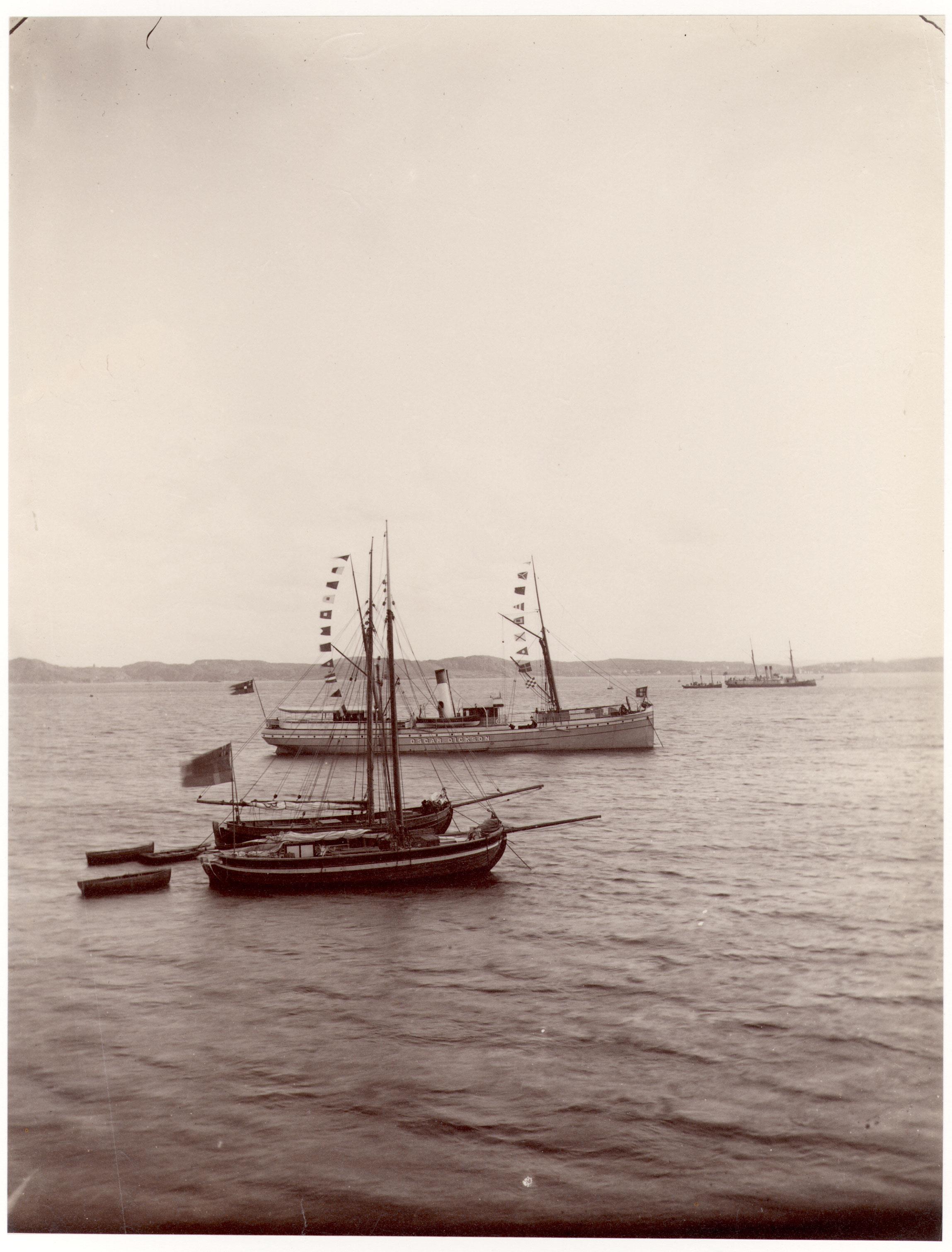 Ångbåten Oscar Dickson och andra båtar på Gullmarn (Gullmarsfjorden) utanför Lysekil. Skaftö på andra sidan vattnet.