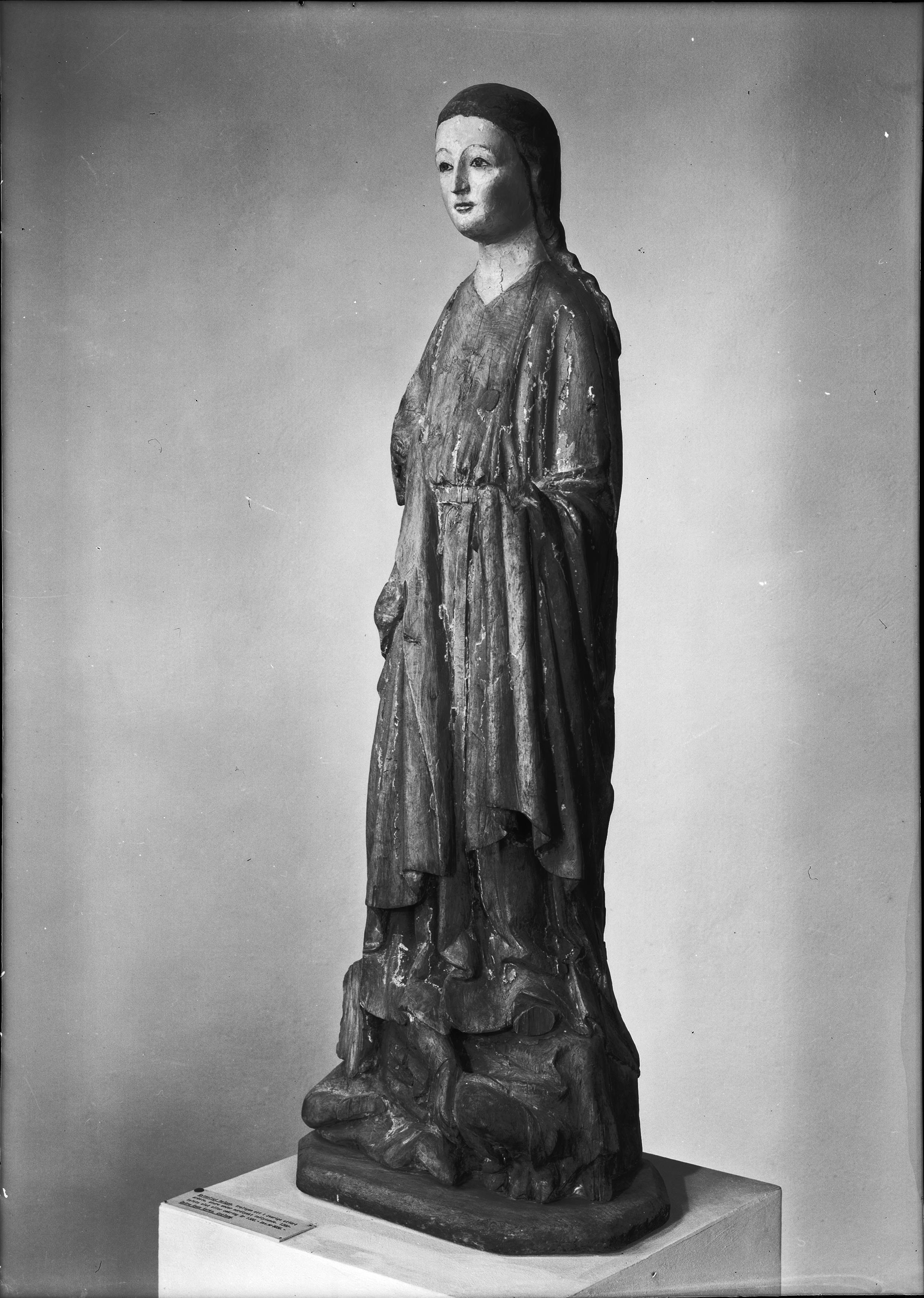 Skulptur, möjligen föreställande Sankta Margareta, trä, omkring 1300.