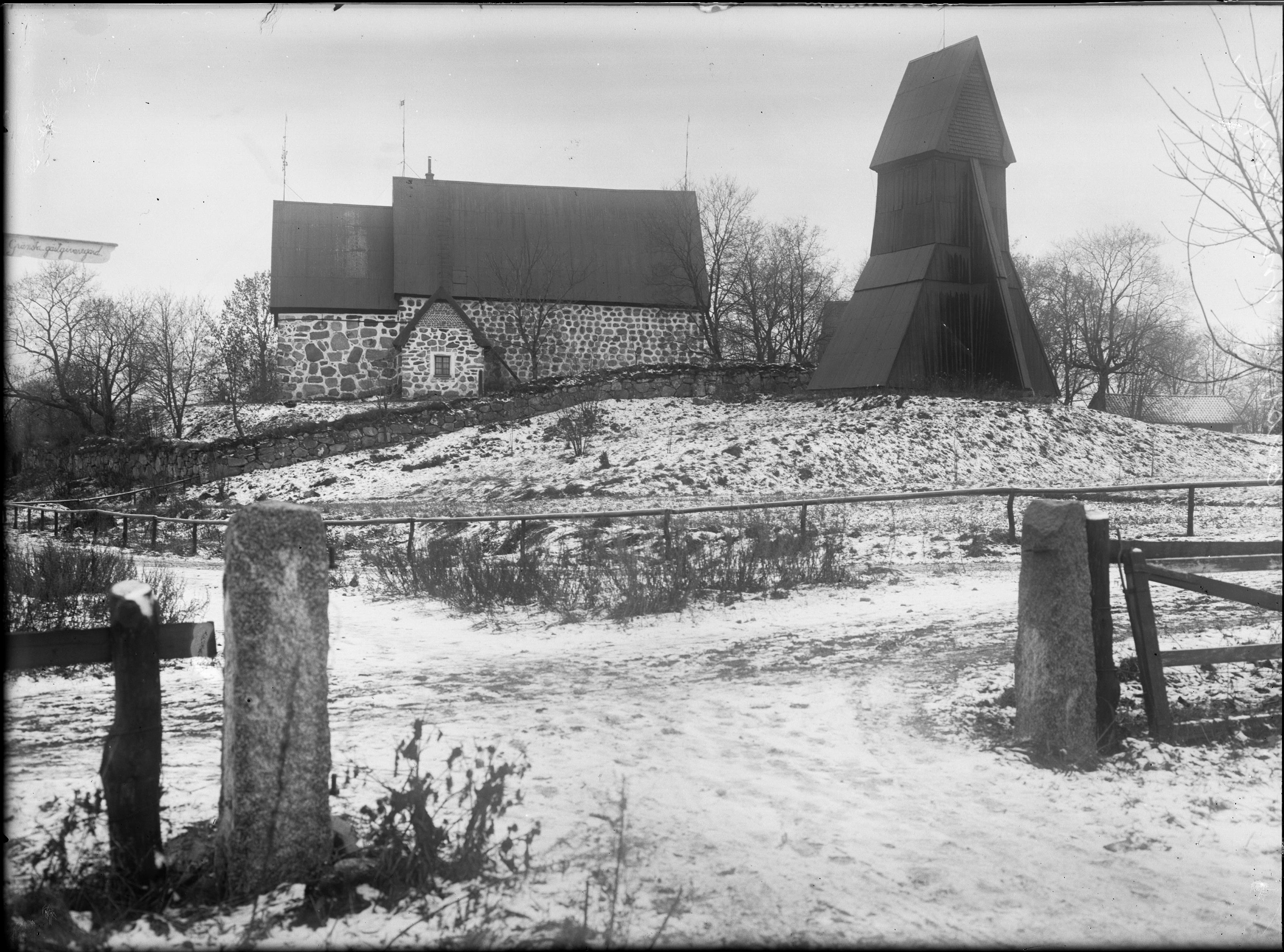 Kyrkan mot norr och klockstapeln.