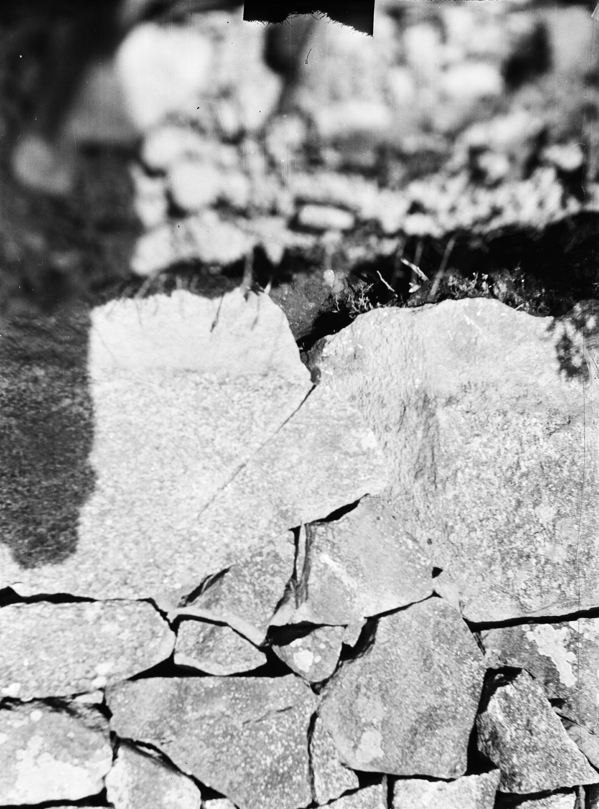 Hörnsten framgrävd under kyrkogårdsmuren, mot väster.