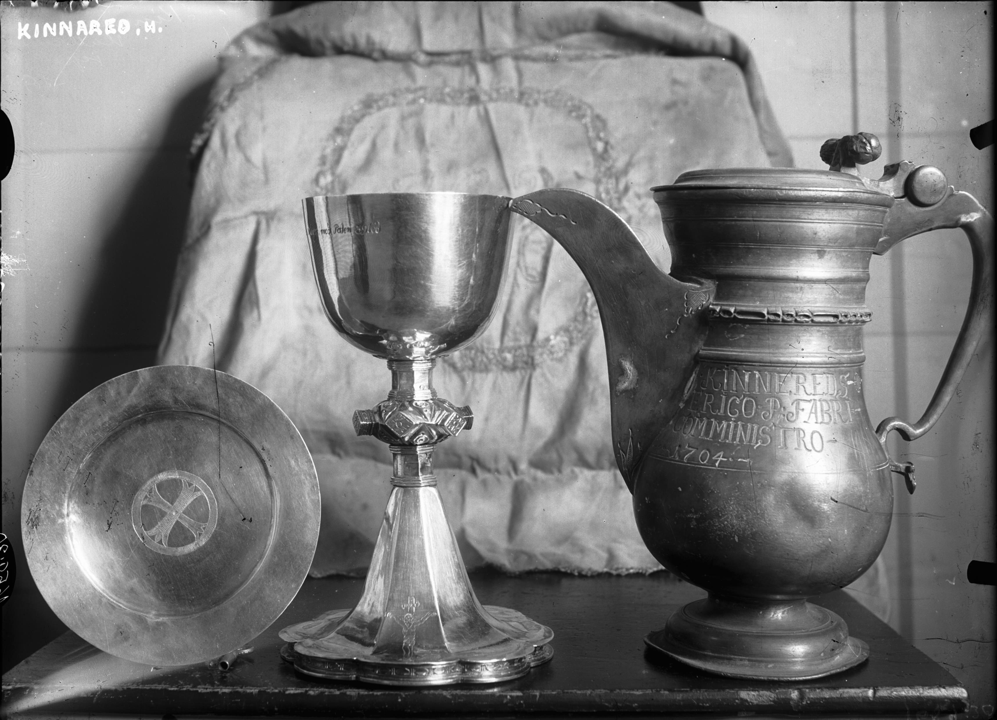 Patén av silver, helt förgylld. Inskrift: "Tillhör Kinnareds Kyrka 1868."