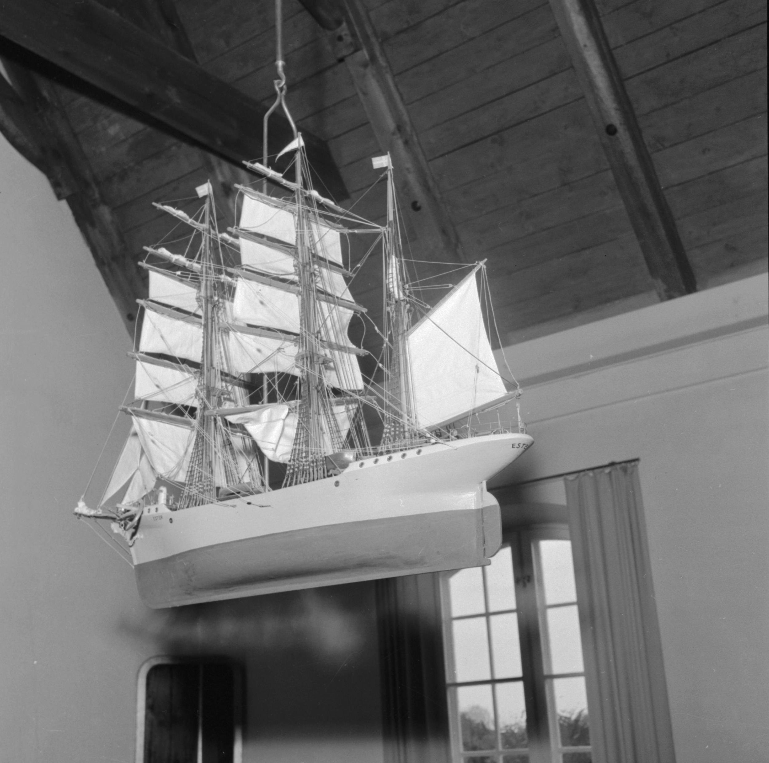 Votivskepp, "Ester" fullriggare, skrovet i grått-rödbrunt. Skänkt år 1943 av lärarinnan Hildur Johansson, tillverkat av hennes bror, en sjöman i Simrishamn.