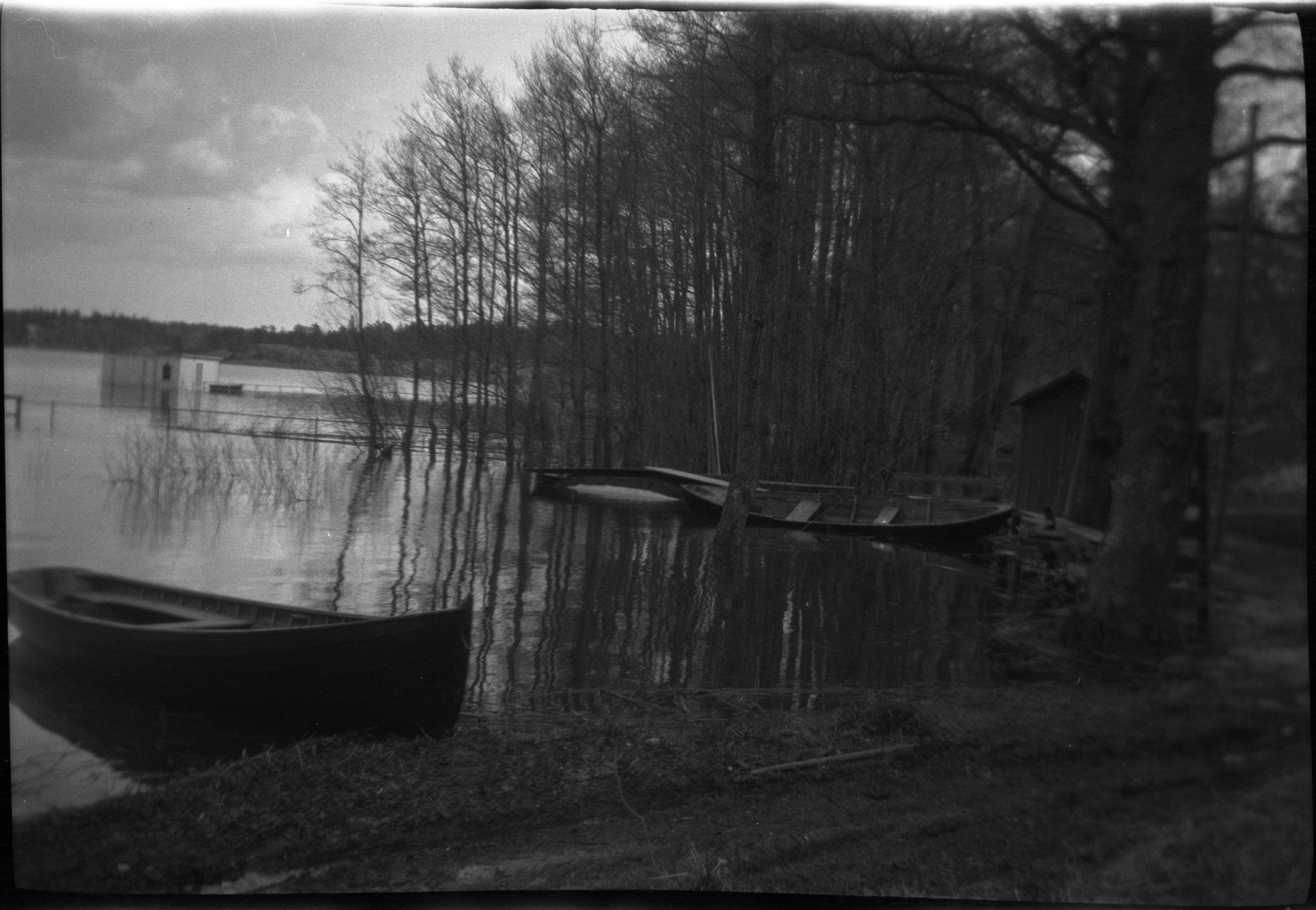 Båtar vid stranden, bod, samt badhus i bakgrunden