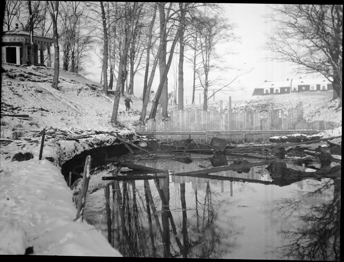 Utgrävningar av den inre vallgraven, "kanalen", vid Rumlaborg i Huskvarna vintern 1934-1935. På bilden syns lusthuset på borgkullens topp till vänster och centralt den plankvägg som satts upp tvärs över vallgraven med syfte att hålla vatten borta. I förgrunden syns stockrester som framkommit i samband med undersökningarna.