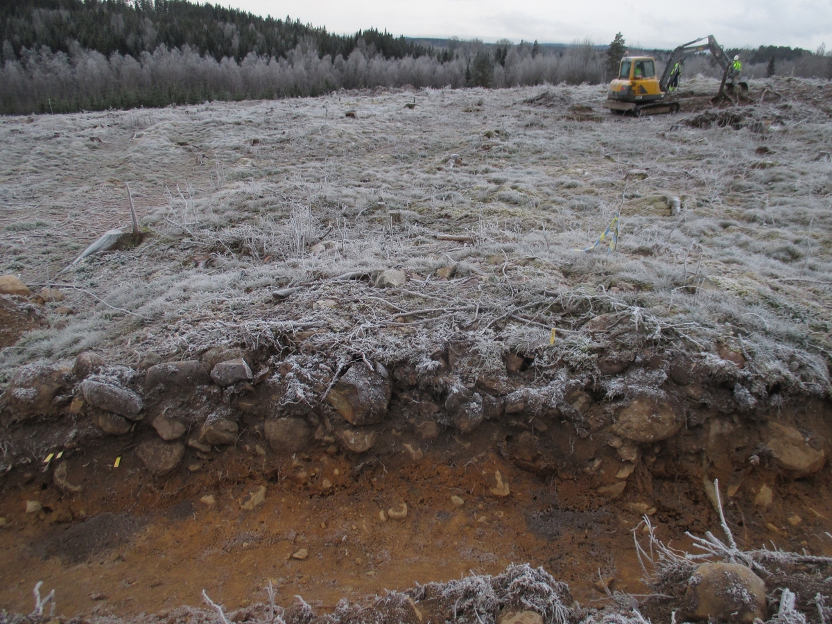 Schakt genom ett av de undersökta röjningsrösena. De gula pinnarna i profilen visar var kolprover och markpollenprover samlats in. I bakgrunden pågår maskinavbaning kring en nyupptäckt domarring på ett litet stenkretsgravfält.
