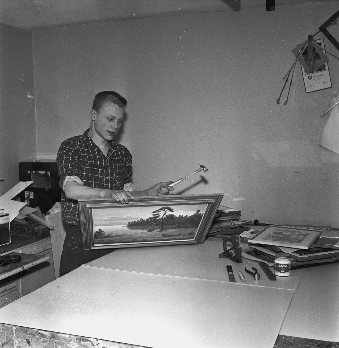 En man står och arbetar med inramning på Huskvarnas glasmästeri.