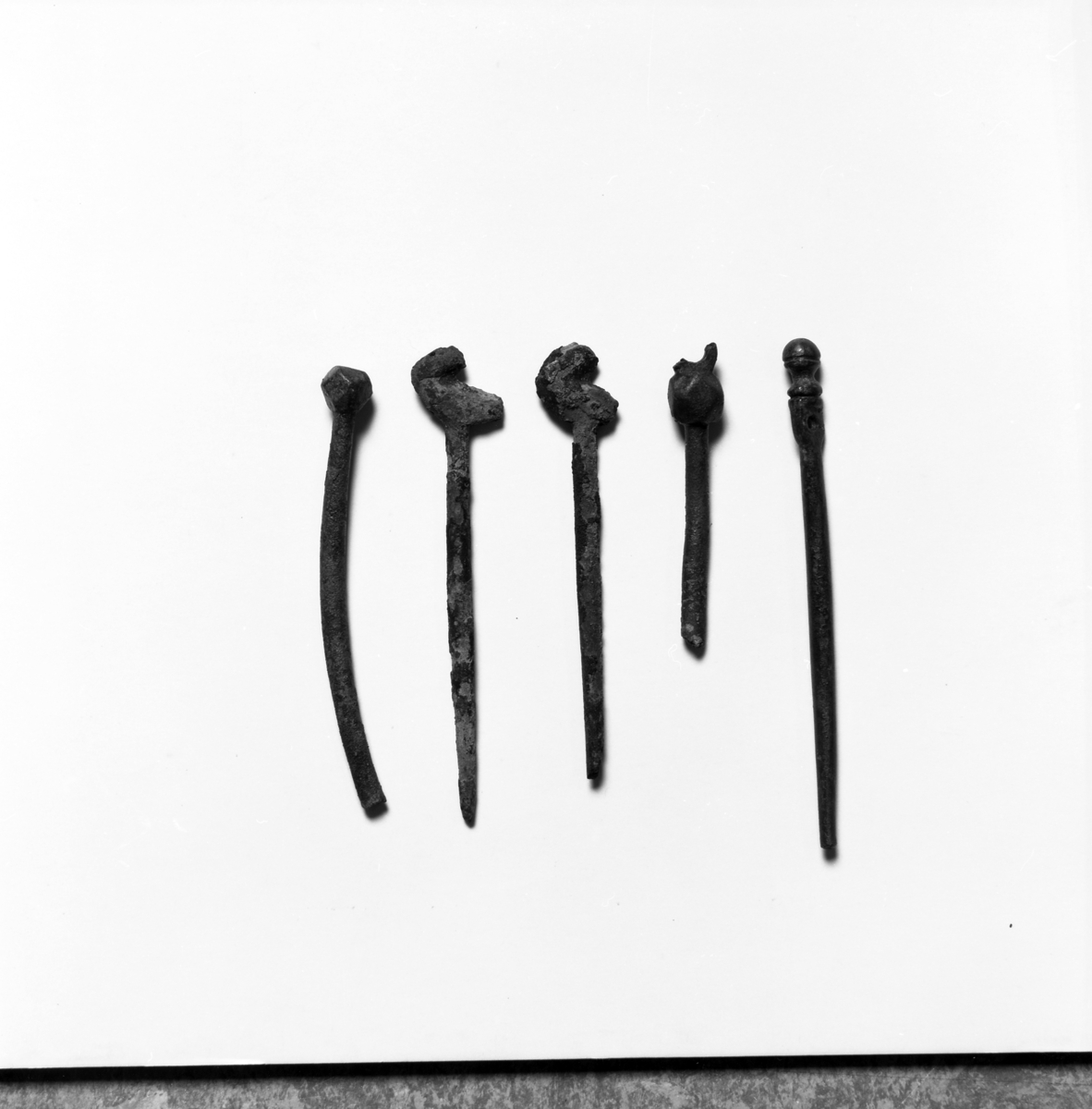 Dränktnålar som påträffats vid en arkeologisk undersökning av ett gravfält i Byarum i Vaggeryds kommun. Fyndnummer JM. 55938:117, :112, :51, :80, och :123. 117: Nål i brons med avbruten spets och polyedrisk huvud (kubisk med avfassetterade hörn).