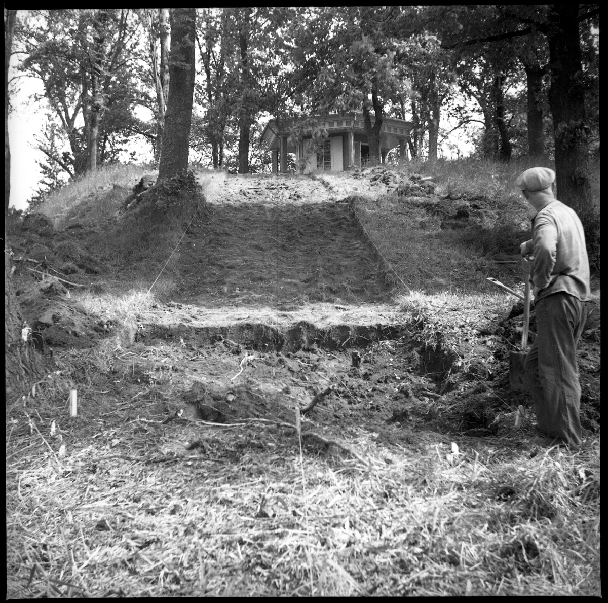 Avtorvningen av Schakt D genom södra delen av borgkullen vid Rumlaborg i Huskvarna är avklarad och fortsatta grävningar kan ta vid. På borgkullens topp skymtar lusthuset och vid sidan av står en man med spade. Bilden togs i samband med arkeologiska undersökningar vid borgen sommaren 1938.