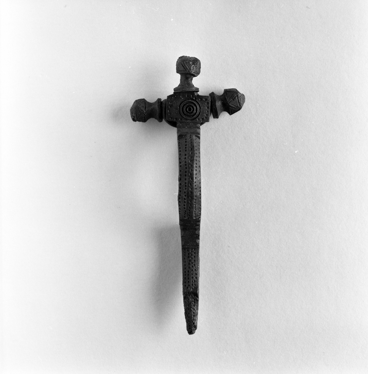 Ett dräktspänne, en s.k. fibula funnen vid en arkeologisk undersökning av ett gravfält i Byarum i Vaggeryds kommun. Fyndet beskrivs som en dekorerad korsformig fibula i brons, i foten ett djurhuvud. Dekor på bågen i form av fem längsgående rader av prickar och tvärstreck. Cirkeldekor på tvärarmens mittplatta.Tvärarmens ändar består av polyedriska knoppar med triangelformade dekor. Fyndnummer JM55938:119