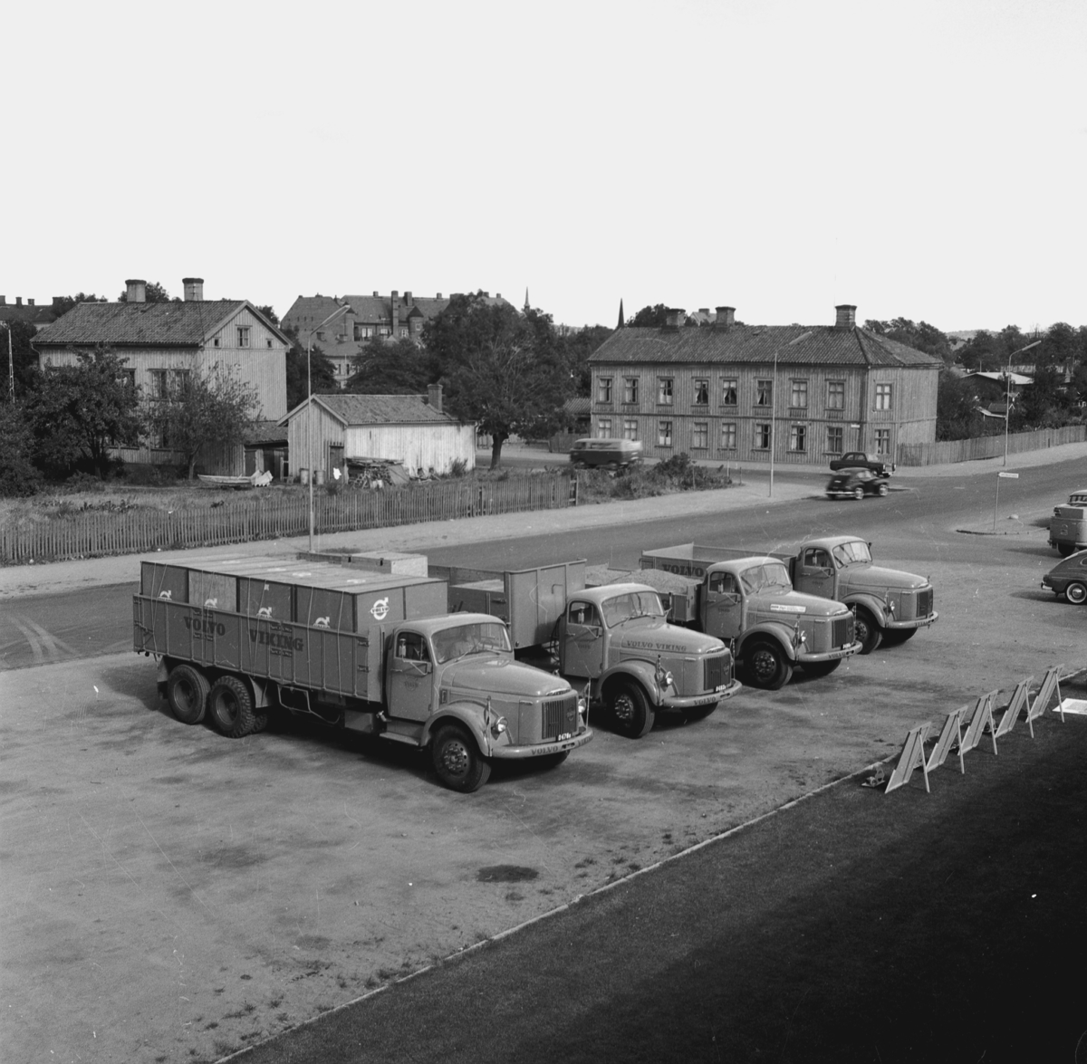 Volvolastbilar står parkerade på rad utanför återförsäljaren Nyströms Bil vid Odengatan i Jönköping.