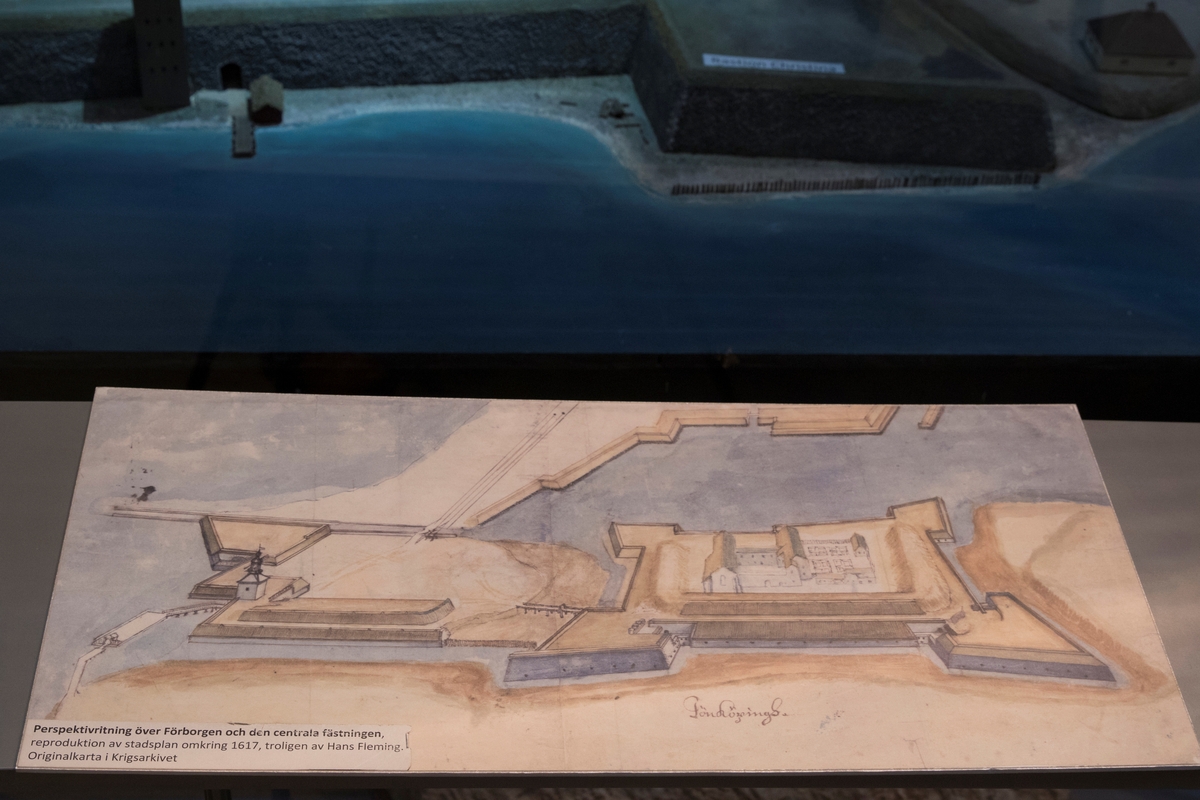 Stadshistoriska utställningen i arkivhuset. Perspektivritning över Förborgen och den centrala borgen, reproduktion av stadsplan 1617. Troligen av Hans Fleming. Originalkarta i Krigsarkivet.