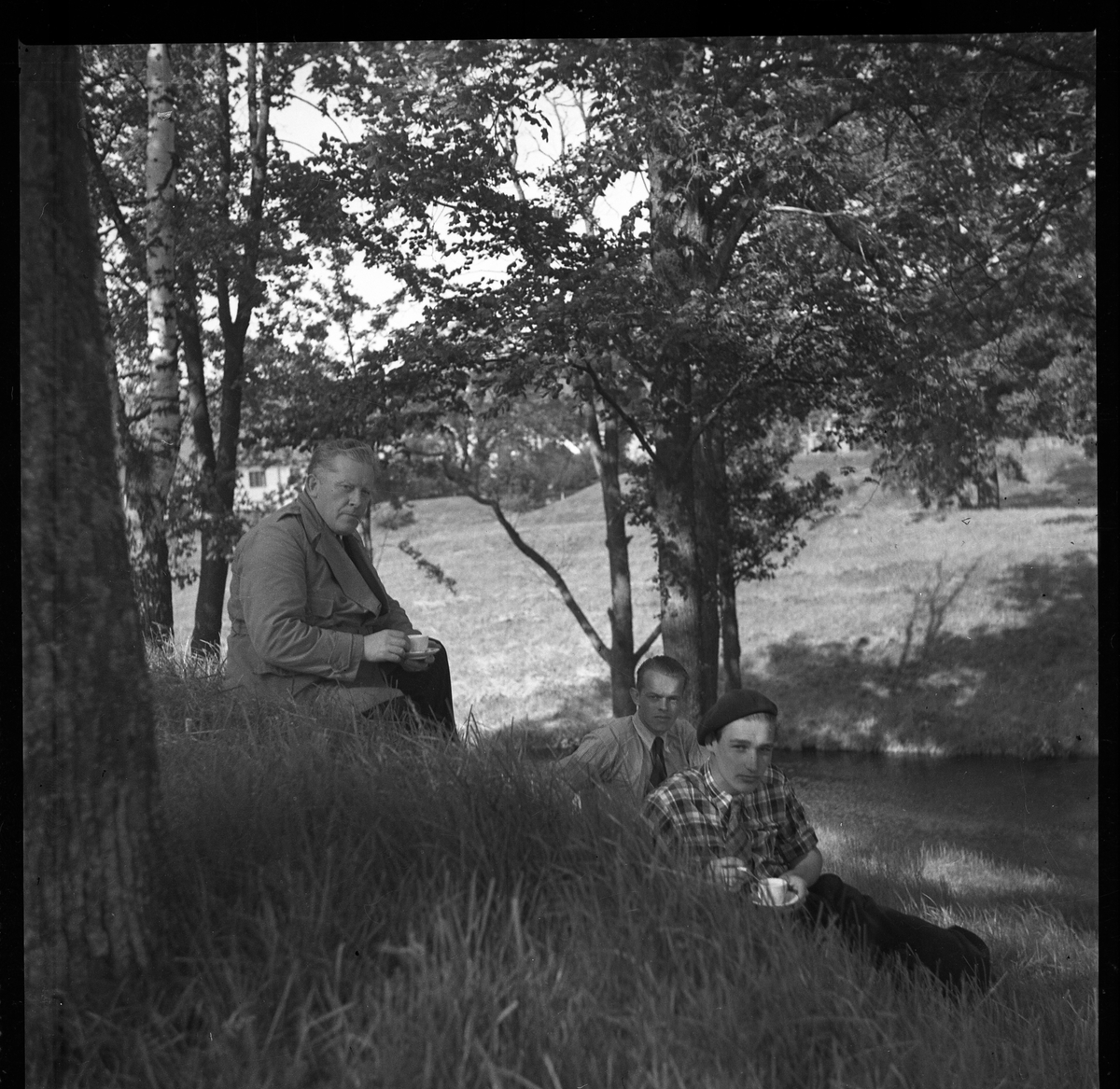 Huskvarna hembygdsförenings ordförande Georg Sahlström tillsammans med amanuensen, fil kand. Anders Lindahl och studeranden vid Jönköpings högre allmänna läroverk Gunnar Hellman tar en fikarast vid sluttningen ner mot den inre vallgraven vid Rumlaborg i Huskvarna. Fotot togs i samband med arkeologiska undersökningar vid borgen sommaren 1938.