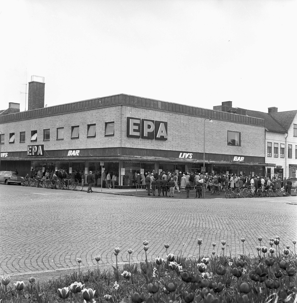 Människor har samlats utanför det nybyggda varuhuset EPA och väntar på att det ska invigas, Huskvarna 12 juni 1962.