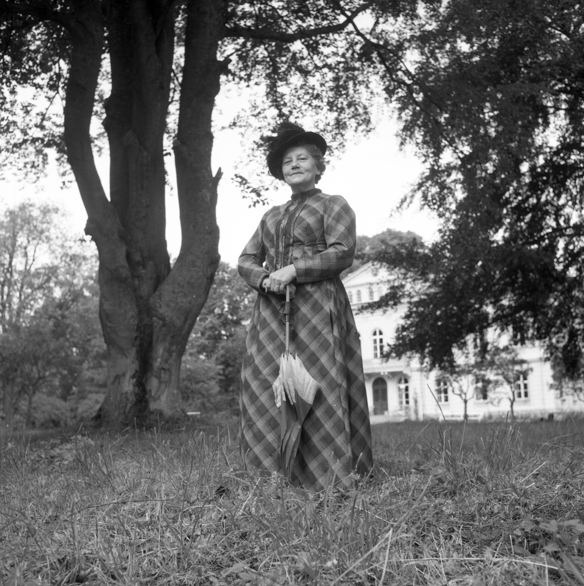 Hembygdsdag i Skärstad den 28 juni 1964. Karin Nell står i parken framför huvudbyggnaden på Lyckås gård.