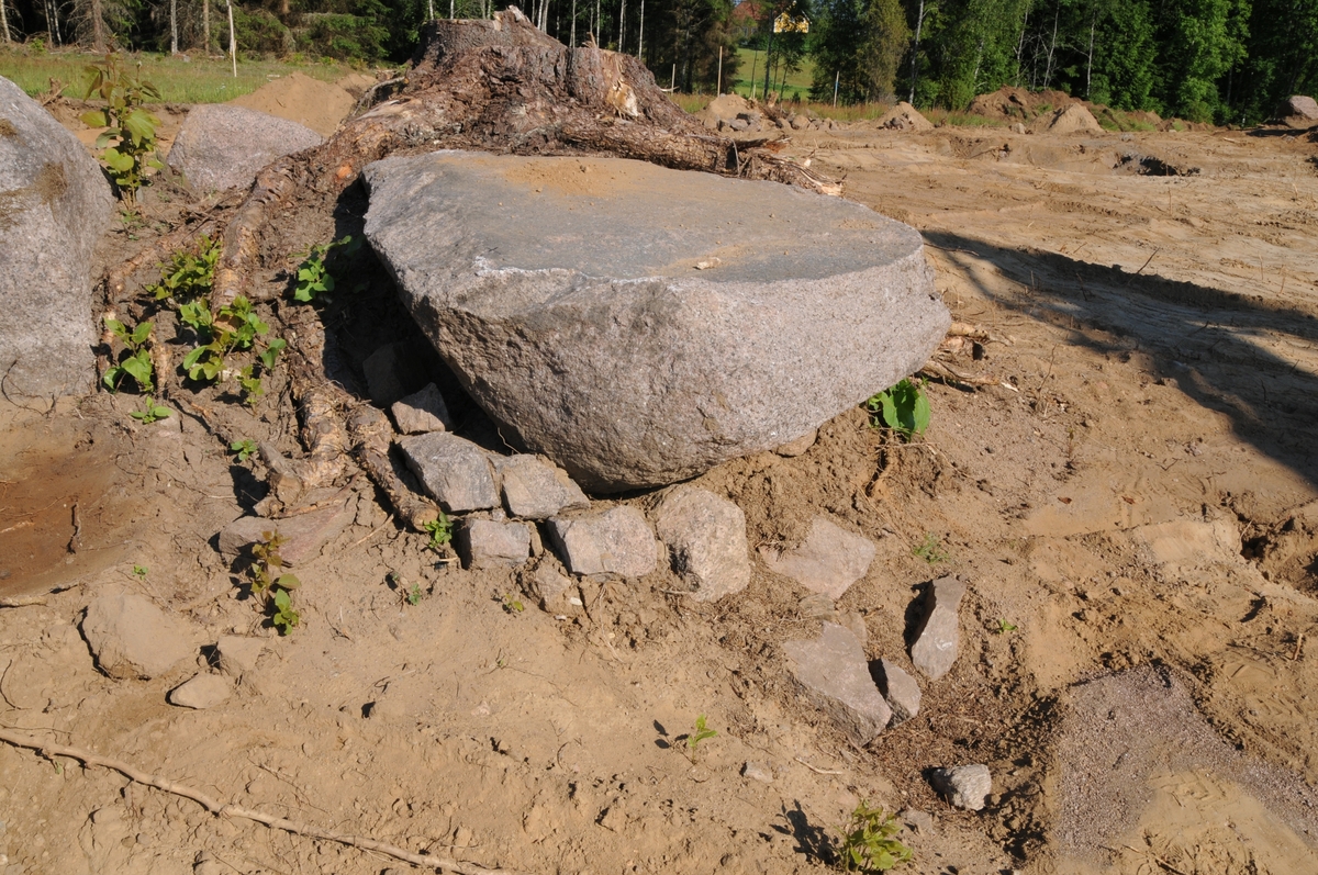 En stor flat sten, uppstagad av mindre stenar, som påträffades vid en arkeologisk undersökning av ett område med brandgravar och en kvadratisk stensättning i Fåglabäck i Tofteryds socken, Vaggeryds kommun.
