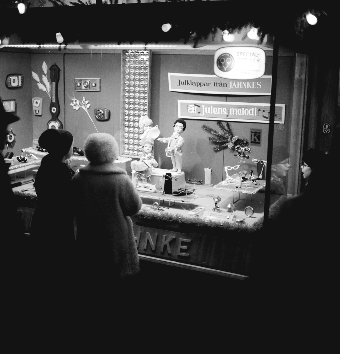Några barn tittar in i glasögonaffären Jahnke som har julskyltat i Jönköping.