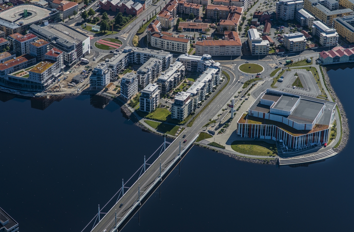 Flygfoto över Jönköping med delar av bostadsområdet Kålgården. Till höger kulturhuset Spira vid Munksjöbron. Till vänster korsningen Odengatan - Östra Strandgatan med rondell.