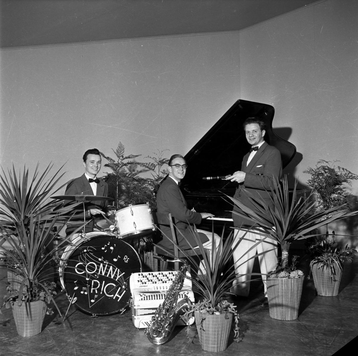 Conny Rich Sandberg med klarinett och 2 musiker, Per Gerdin vid flygeln och Rune Ekström vid trummor.
