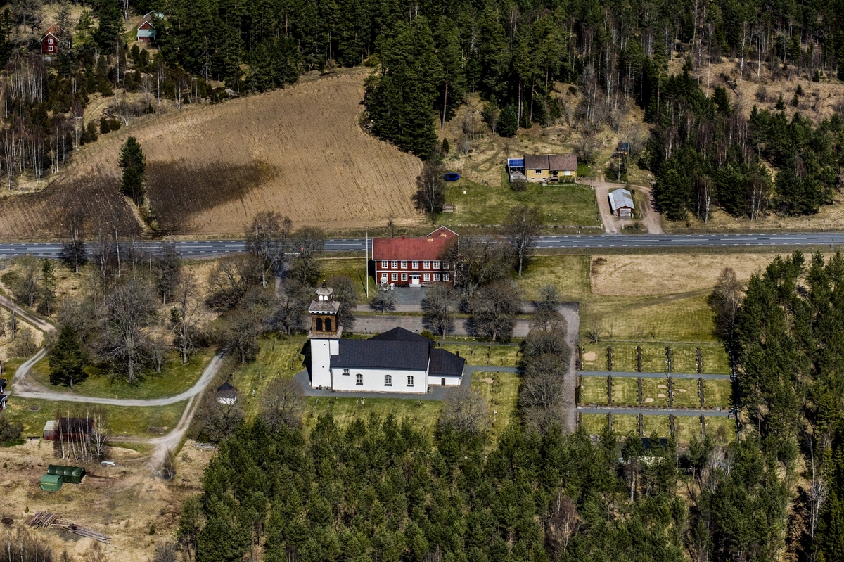 Flygfoto över Bälaryd kyrka i Aneby kommun.