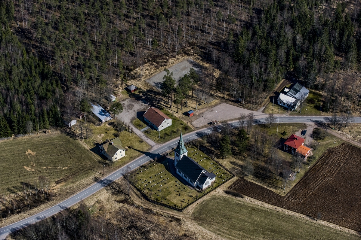 Titel: Flygfoto över Valdshults kyrka i Gislaveds kommun.