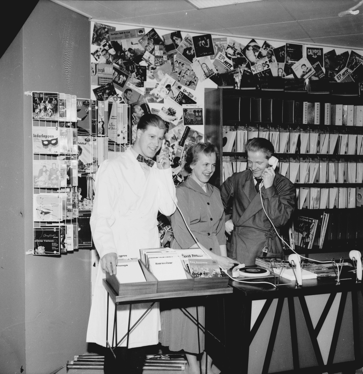 Personalen på Konsum i Huskvarna står och lyssnar på skivor.