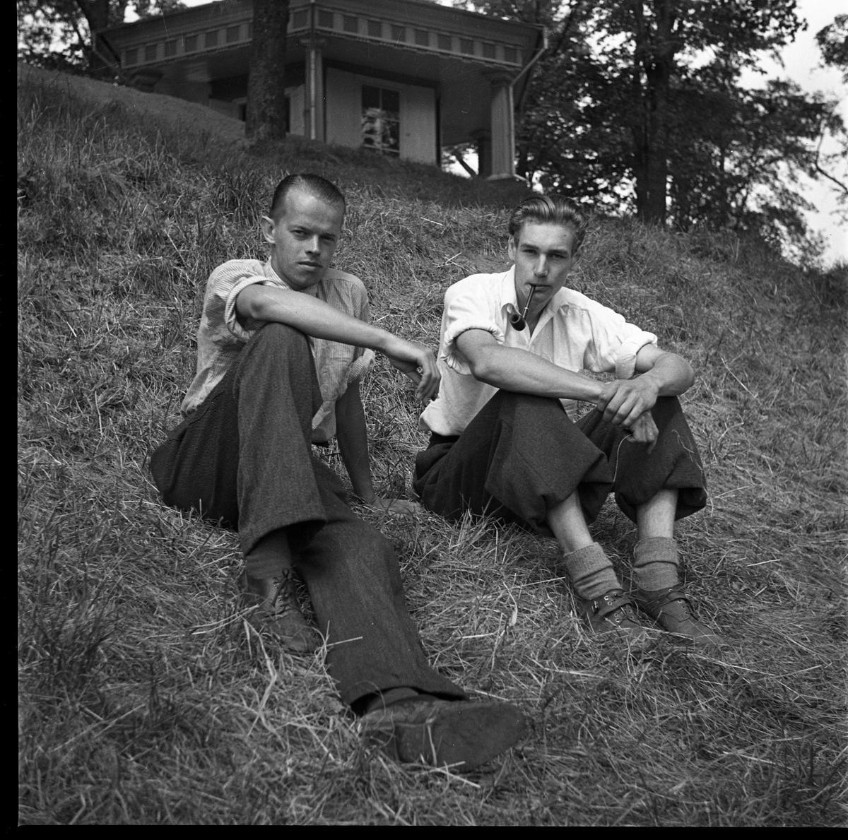 fil. kand. Anders Lindahl till vänster samt en ung man som inte har identifierats. De sitter strax nedanför lusthuset på borgkullen vid Rumlaborg i Huskvarna i samband med arkologiska undersökningar där sommaren 1937. Anders Lindahl var projektledaren, Georg Sahlströms närmaste man vid flera av undersökningarna.