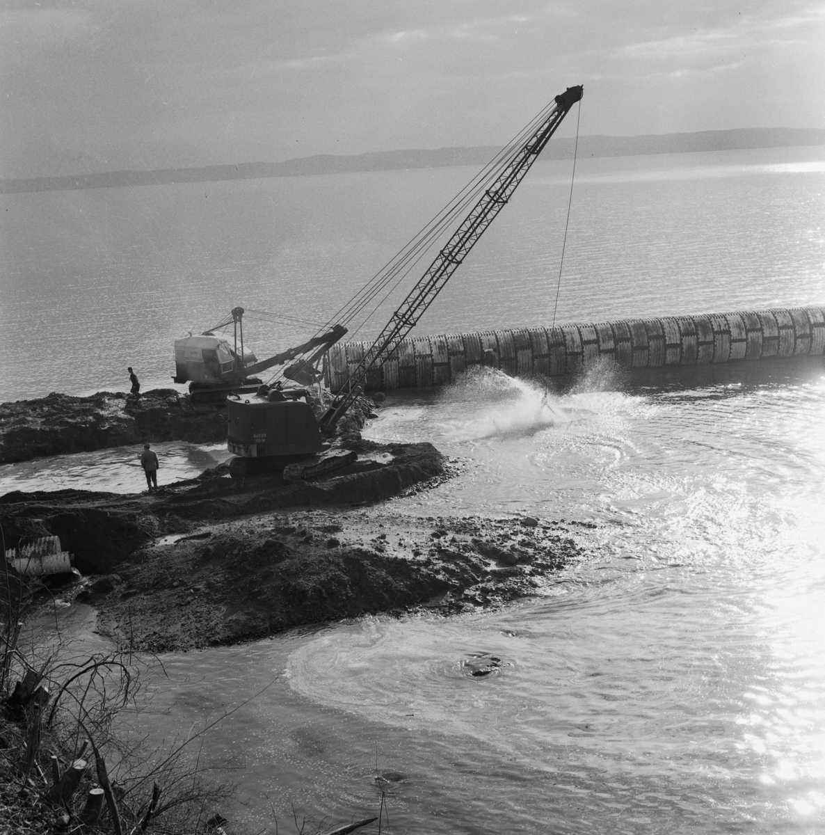 Olika maskiner håller på för att få avloppstunneln på plats vid Edeskvarna kraftstation.