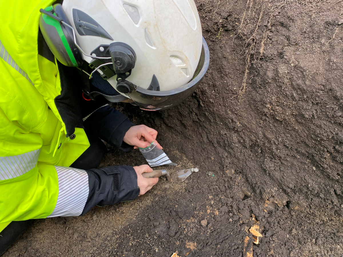 En arkeolog plockar fram mynt hörande till en myntskatt som just upptäckts i en grav från 1100-talet på Brahekyrkogården på Visingsö i Jönköpings kommun och län.
