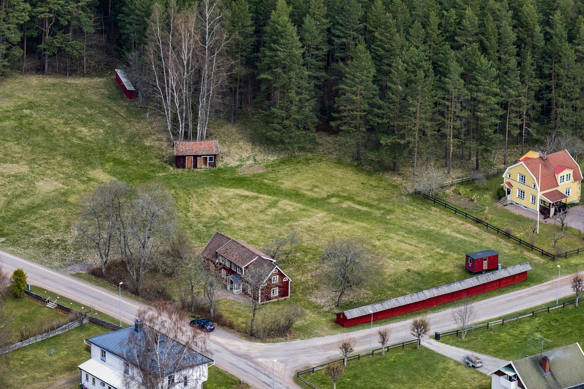 Flygfoto över Adelöv i Tranås kommun. Utmed vägen ligger en rad marknadsbodar.