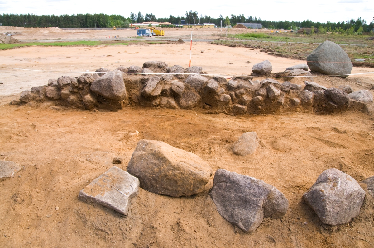 En kvadratisk stensättning i profil. I förgrunden syns stenar hörande till kantkedjan. Bilden har tagits vid en arkeologisk undersökning i Fåglabäck i Tofteryds socken, Vaggeryds kommun.